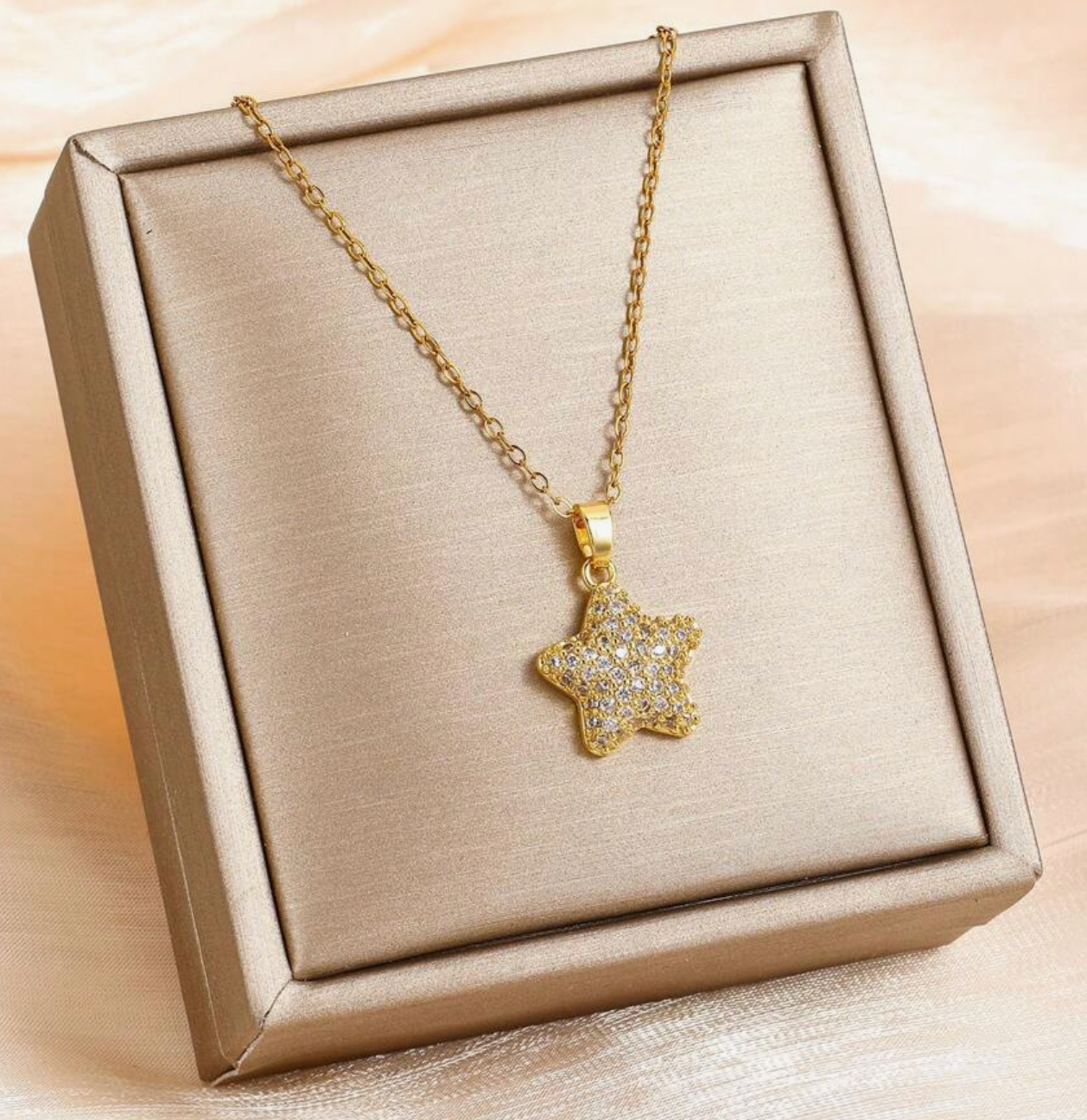 1 pieza Collar con colgante de estrella de cinco puntas y estrella de mar de circonita cúbica chapada en oro con cadena de acero inoxidable para niñas adolescentes, moda versátil para fiestas callejeras, viajes, festivales y uso diario, regalo de cumpleaños para niños.