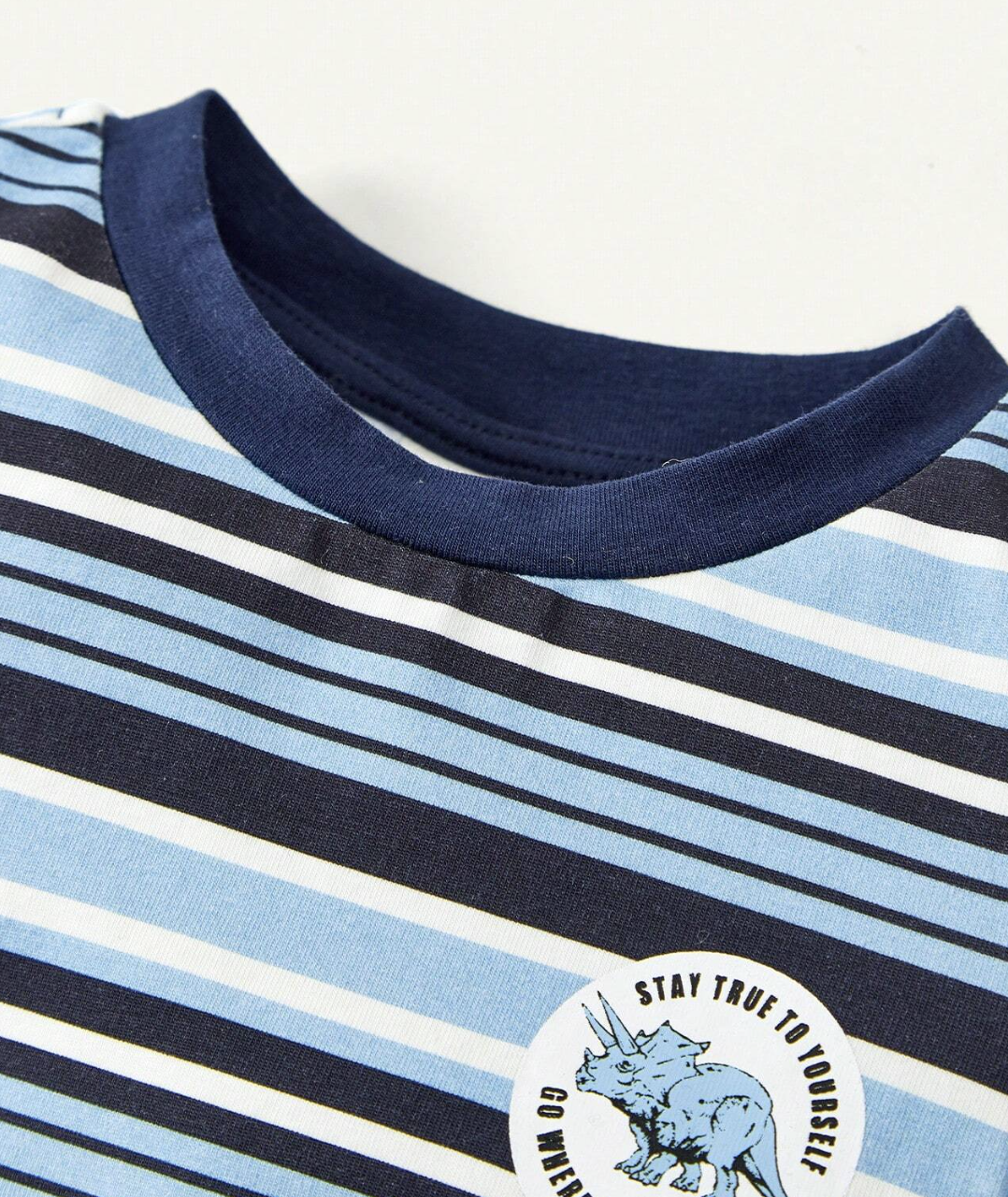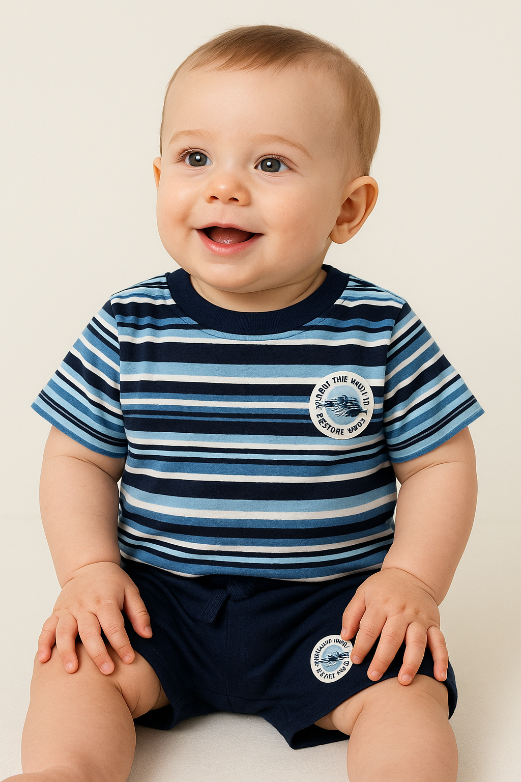 Conjunto casual de dos piezas para niño, con estilo deportivo y moderno. Ideal para uso diario, paseos o actividades al aire libre. Combina comodidad, frescura y un toque divertido con su diseño rayado en tonos marinos.