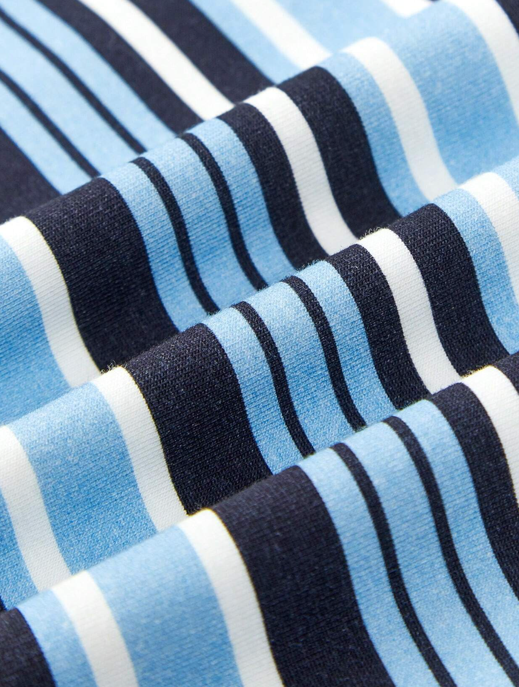 Color: Azul marino con rayas horizontales en tonos azul claro, blanco y negro.