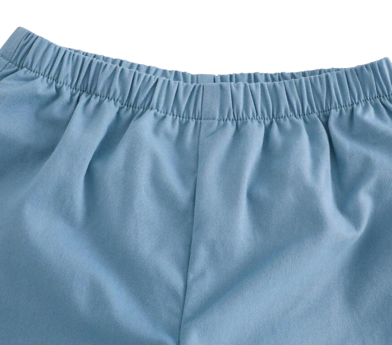 Shorts lisos en tono azul celeste con pretina elástica y detalle de etiqueta lateral.