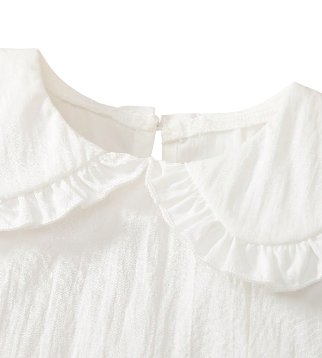 Cuello: Cuello redondo con doble volante o “babero” plisado, que aporta un toque romántico y elegante.