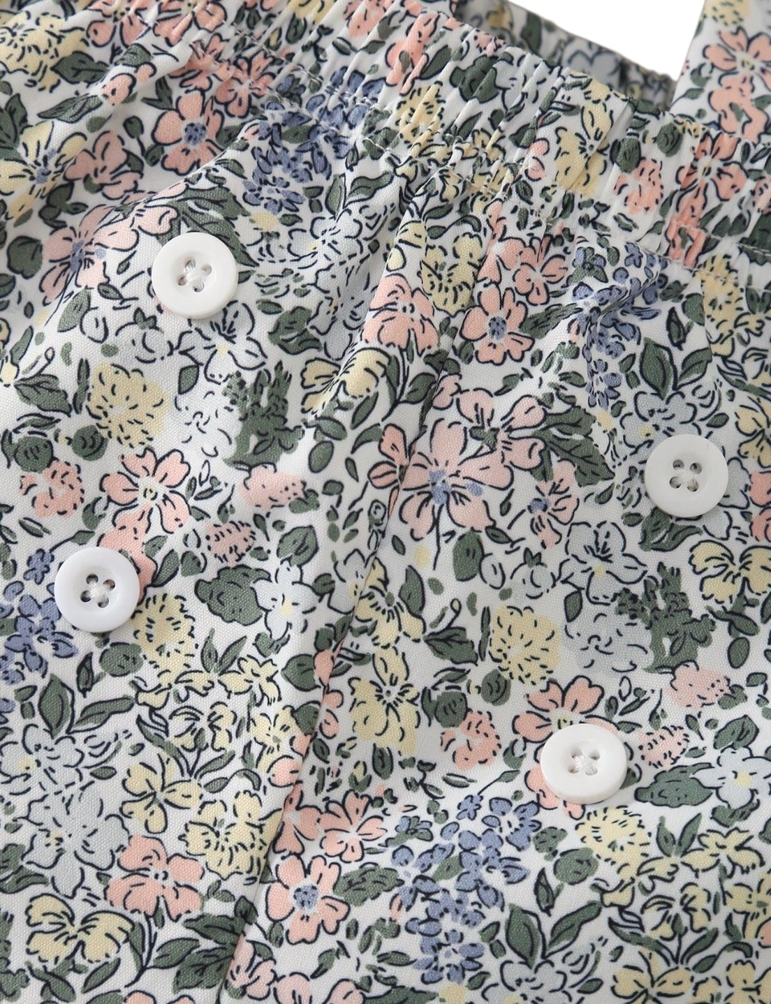Conjunto para niña compuesto por blusa blanca con cuello decorativo y short con tirantes cruzados de estampado floral, ideal para primavera o verano.