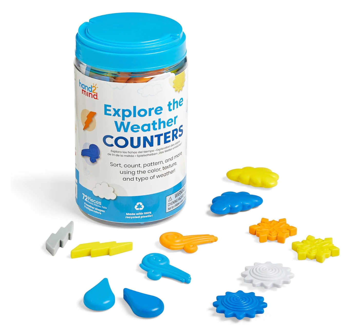 Estos coloridos contadores de Explore the Weather vienen en 6 formas relacionadas con el clima (sol, nube, rayo, lluvia, viento, nieve) y en 6 colores diferentes para ayudar a los niños a aprender a identificar los elementos meteorológicos básicos.