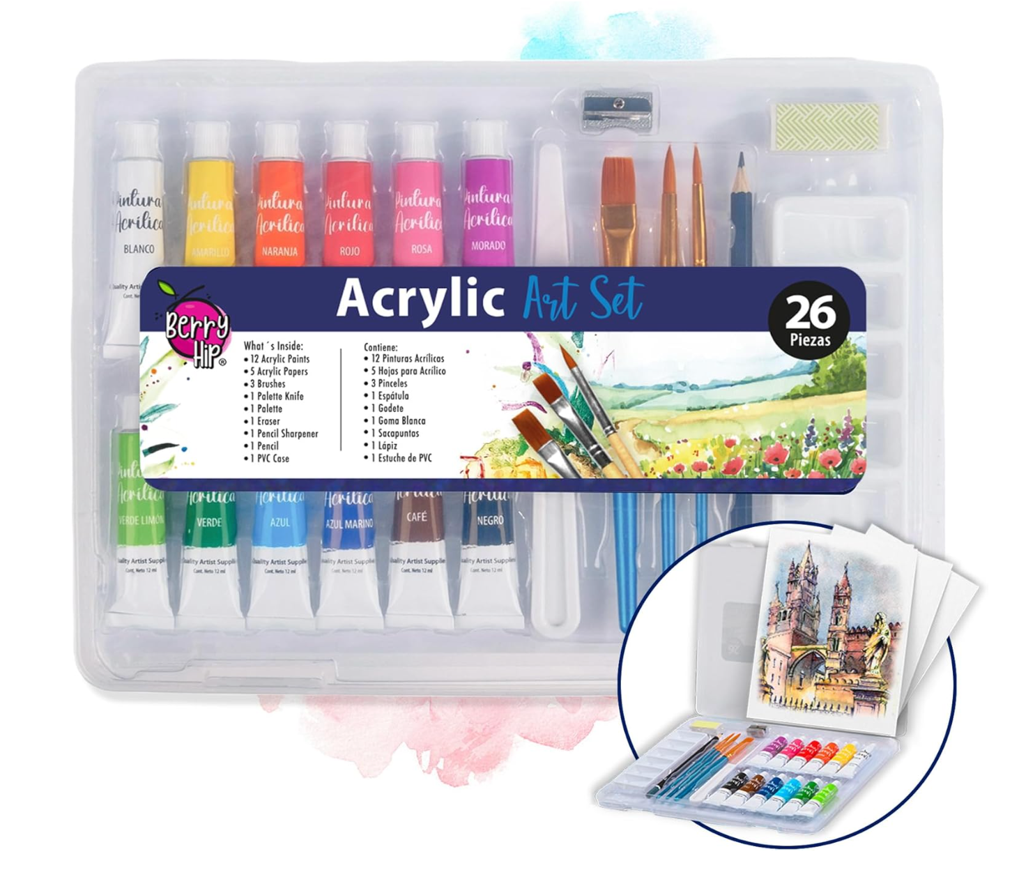 - Accesorios Esenciales: Con una gama de herramientas para bocetar, como una espátula, una paleta de pintura, una goma , un lápiz y un sacapuntas, que agregan valor y facilitan el proceso creativo.