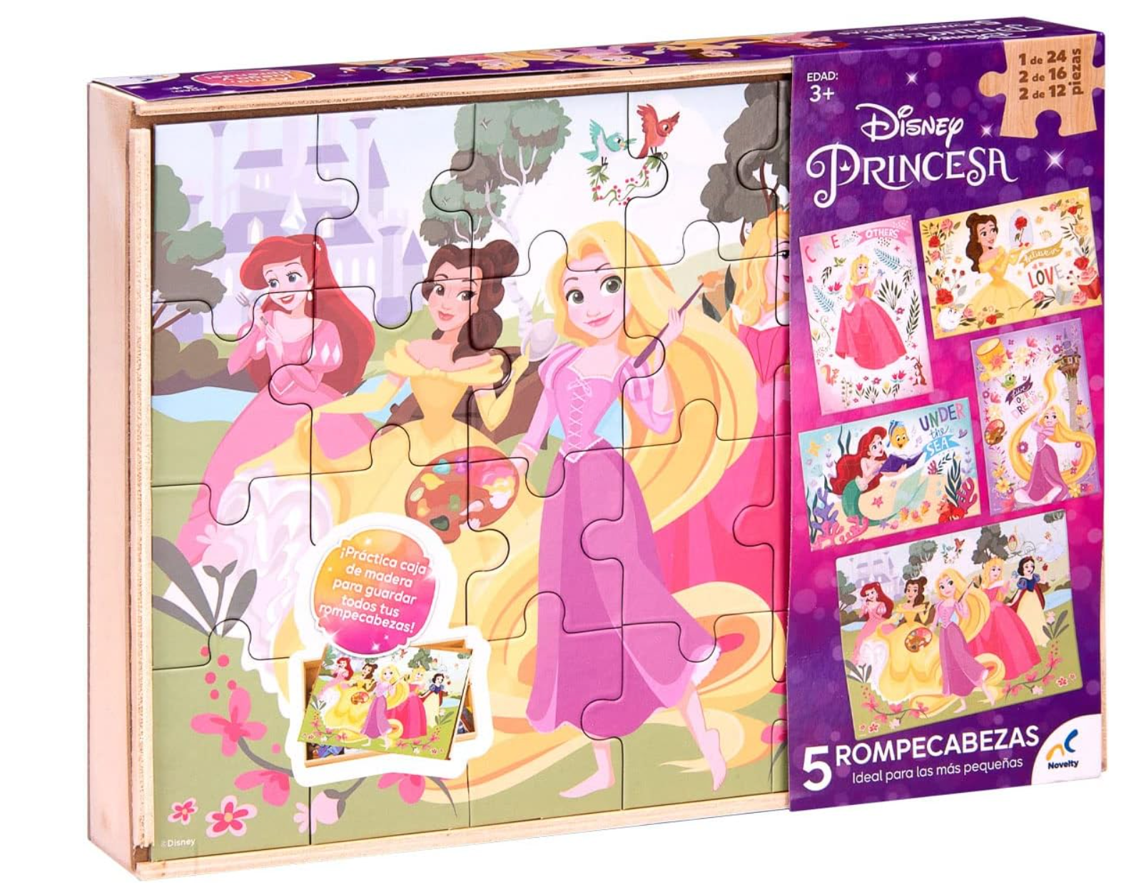 - ROMPECABEZAS 5 EN 1. Rompecabezas infantil de Princesas de Novelty. Vienen 5 rompecabezas de cartón resistente. Distintos niveles de dificultad para mejorar la habilidad motriz, lógica y de pensamiento. Edad recomendada: 3+.