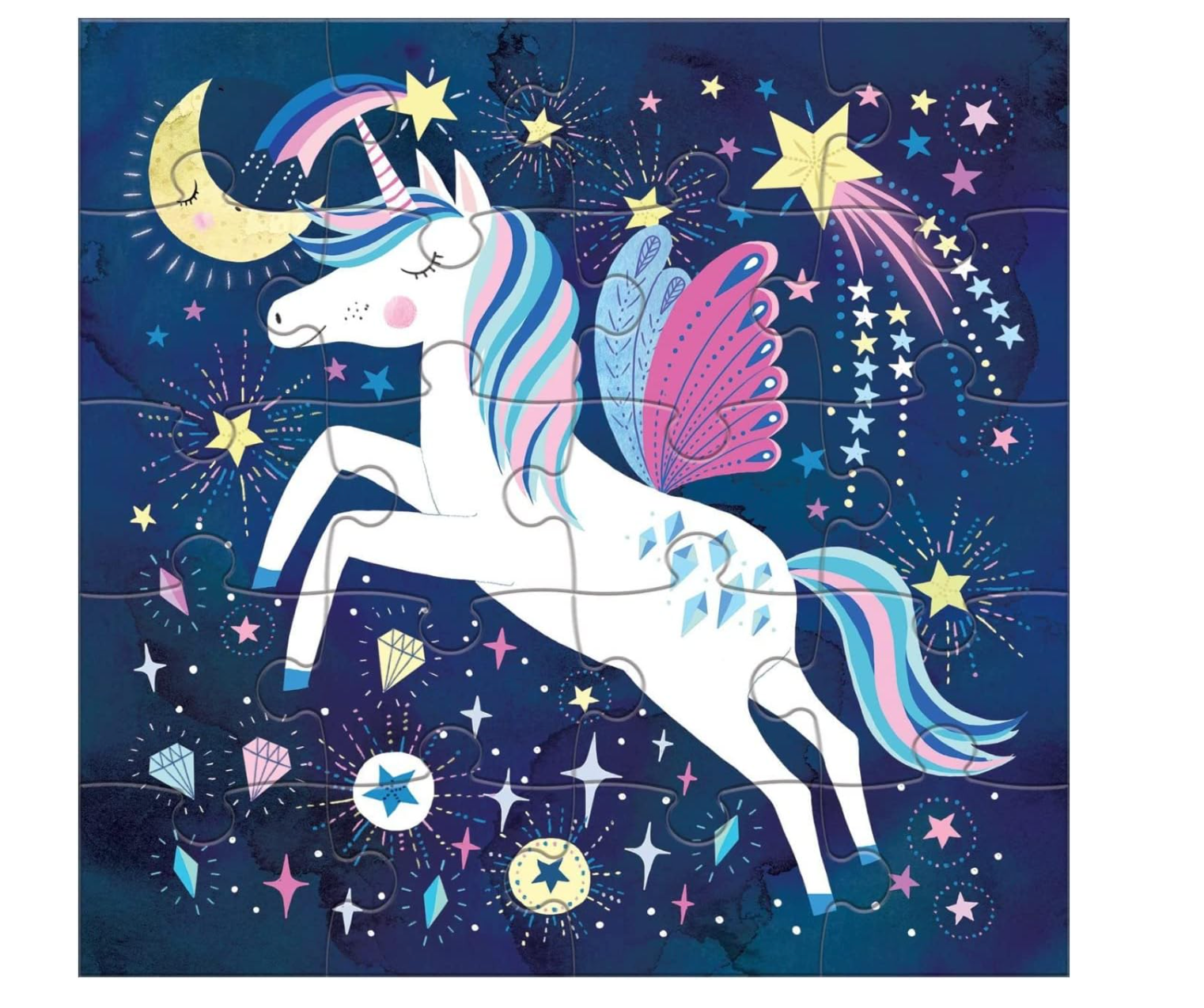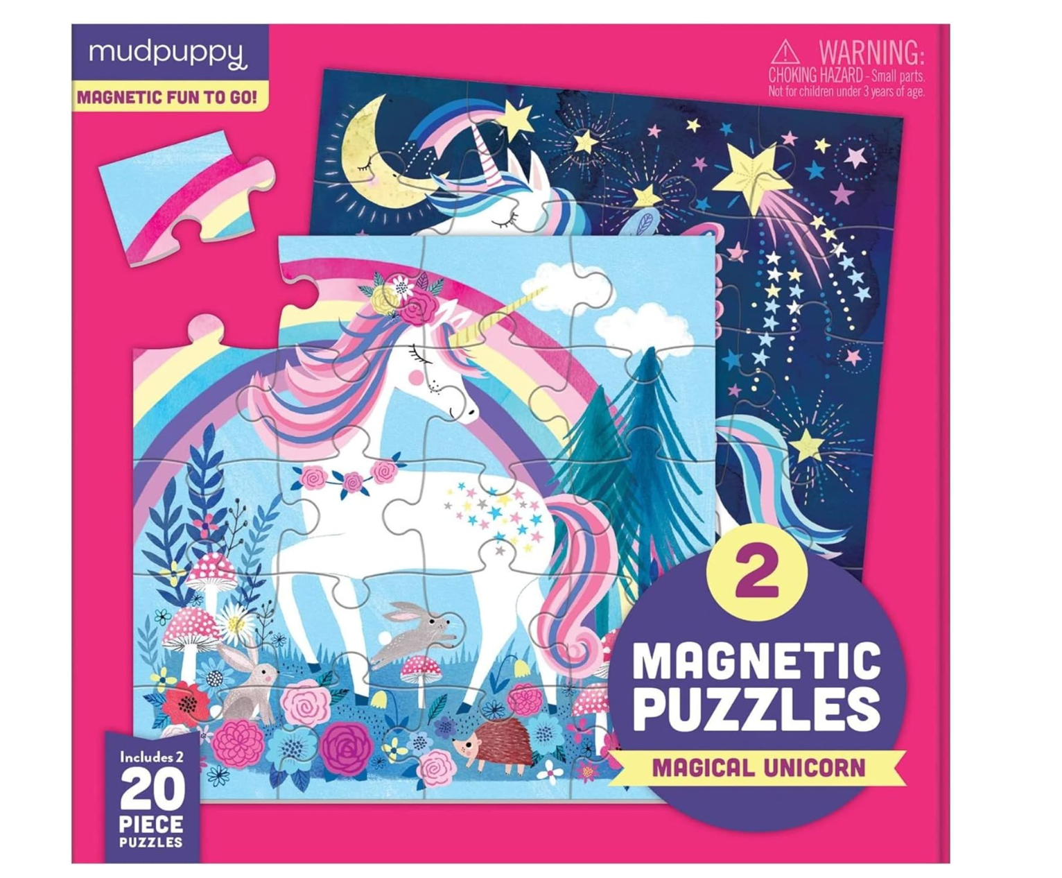 - Rompecabezas: el rompecabezas magnético mágico de unicornio de Mudpuppy incluye dos rompecabezas de 20 piezas que cuentan con encantadoras obras de arte de unicornios mágicos en el cielo. Las piezas grandes son del tamaño adecuado para que las manos pequeñas manipulen. El rompecabezas es una gran actividad para que los niños hagan solos o para que las familias se unan y resuelvan el rompecabezas juntos, todo mientras crea una experiencia de unión positiva para los jóvenes. La portafolios triple muestra la obra de arte de rompecabezas completada y es un lugar ideal para mantener las piezas seguras y libres de daños.
