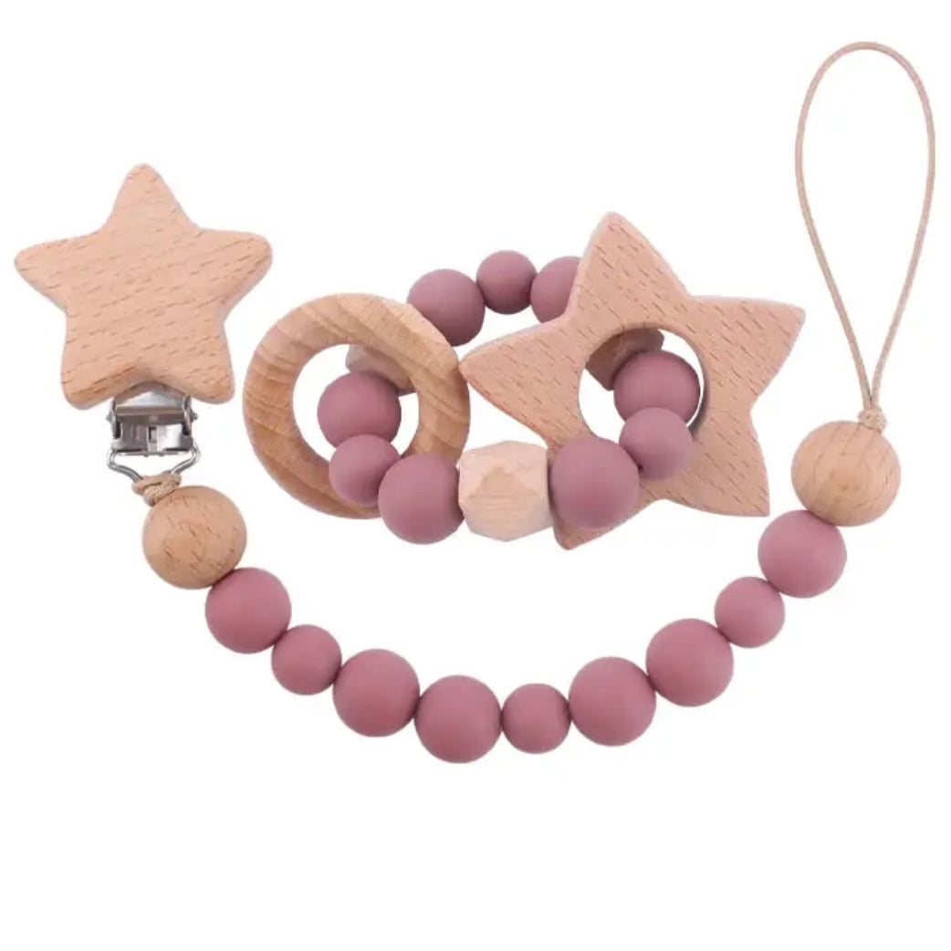 Juego de Chuponero y Sonajero Silicon con madera en vasrias fotmas, libres de BPAS